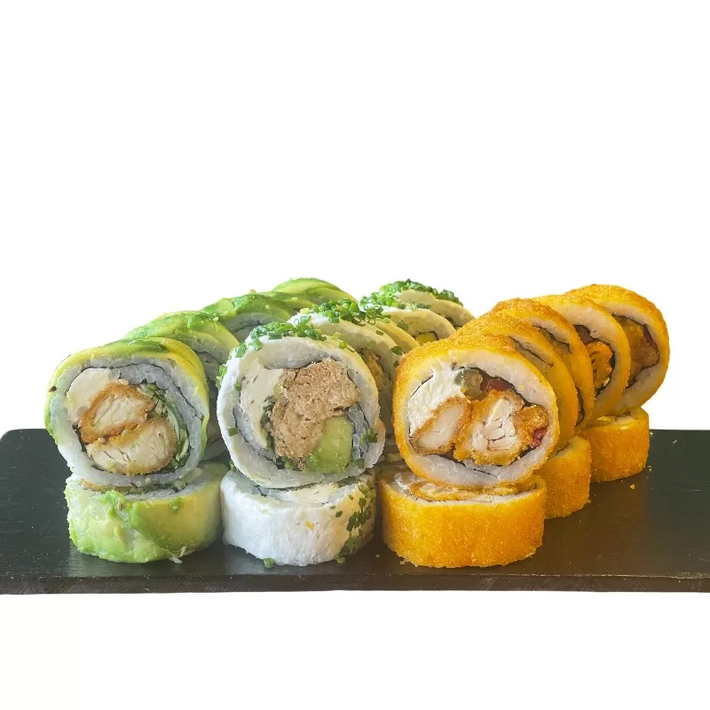 Pollo apanado, queso crema, cebollin Envuelto en Palta